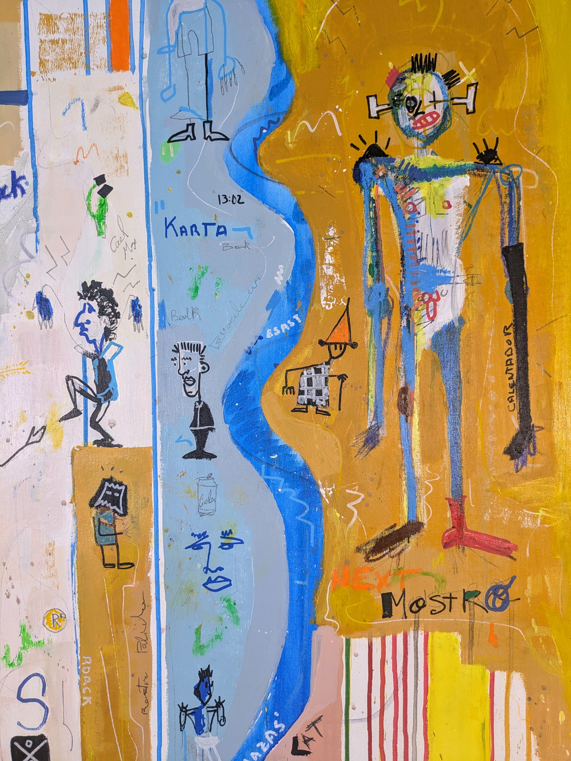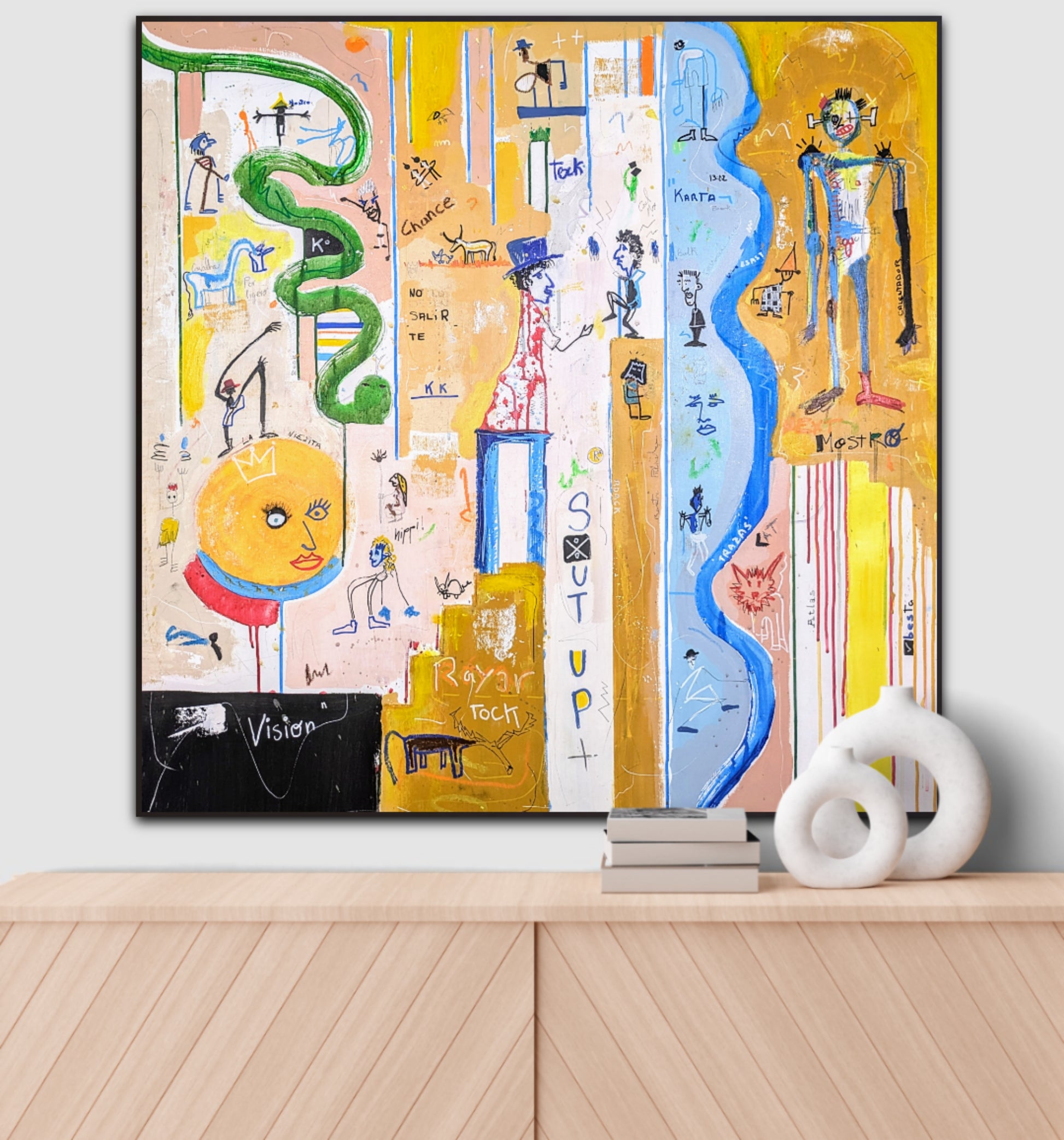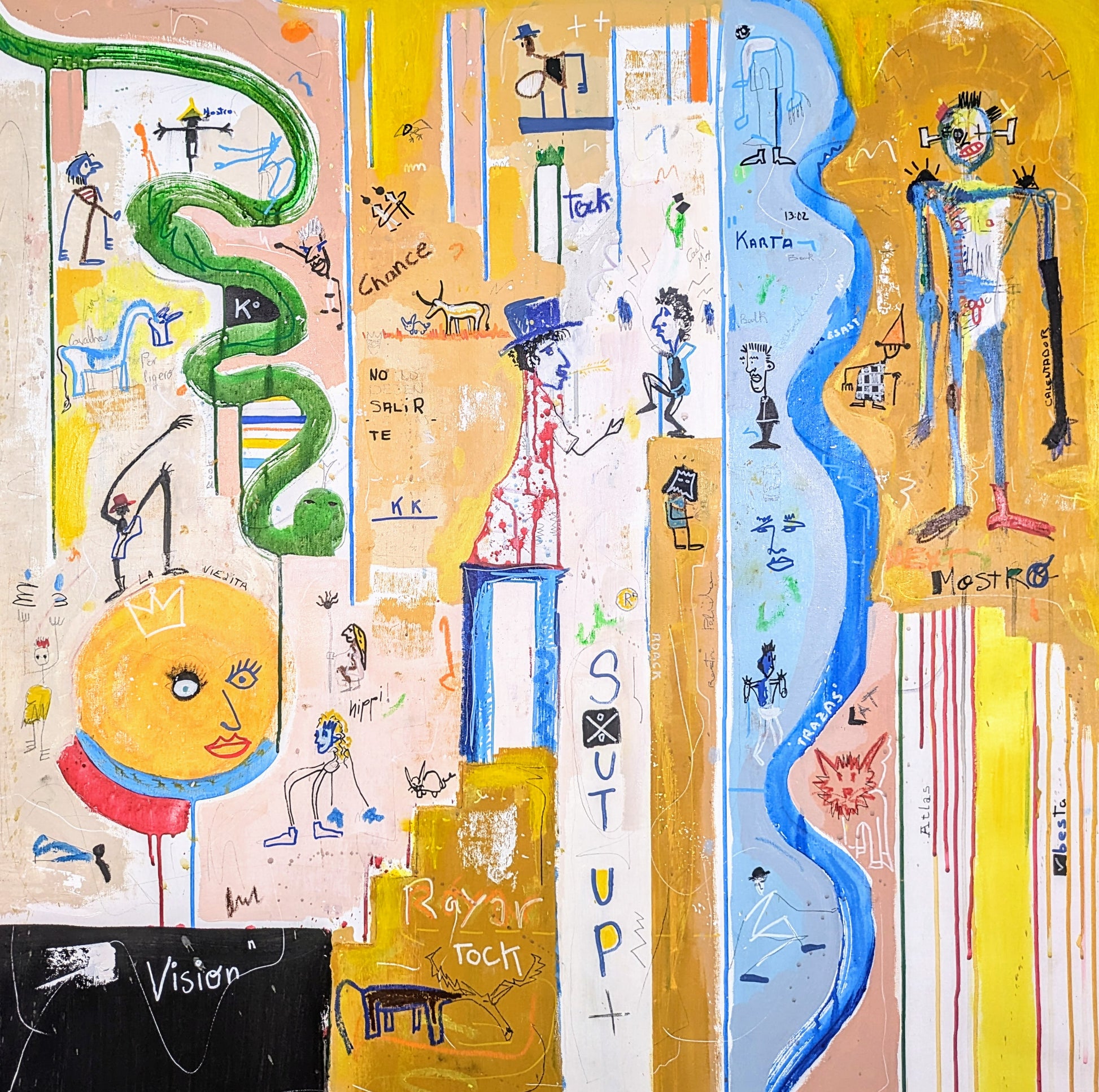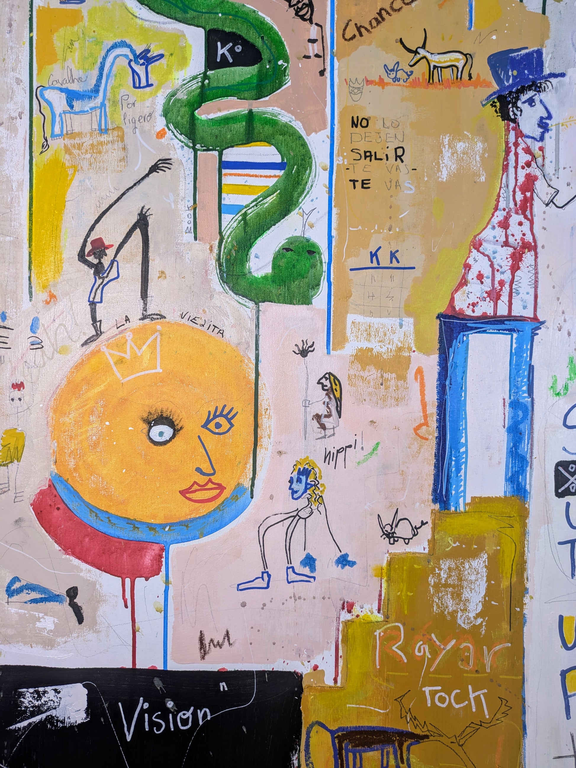 Técnica: acrílico, pigmentos, oil stick, lápiz, carboncillo y papel.