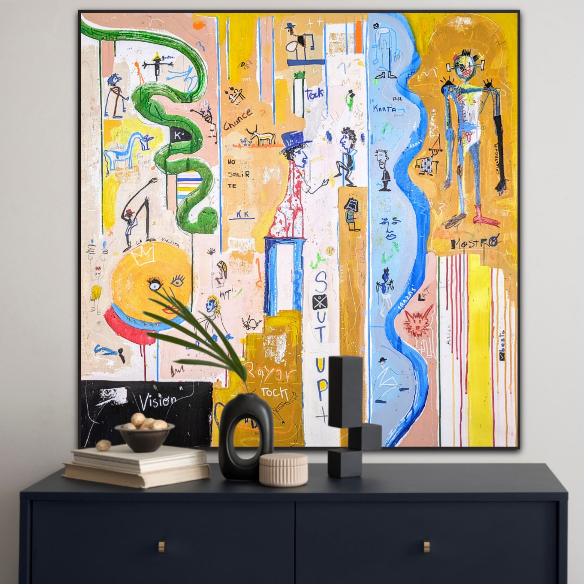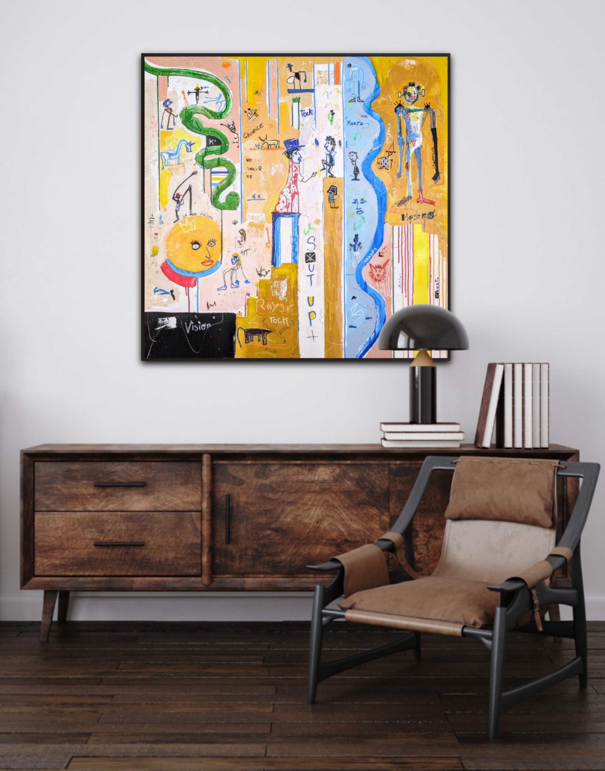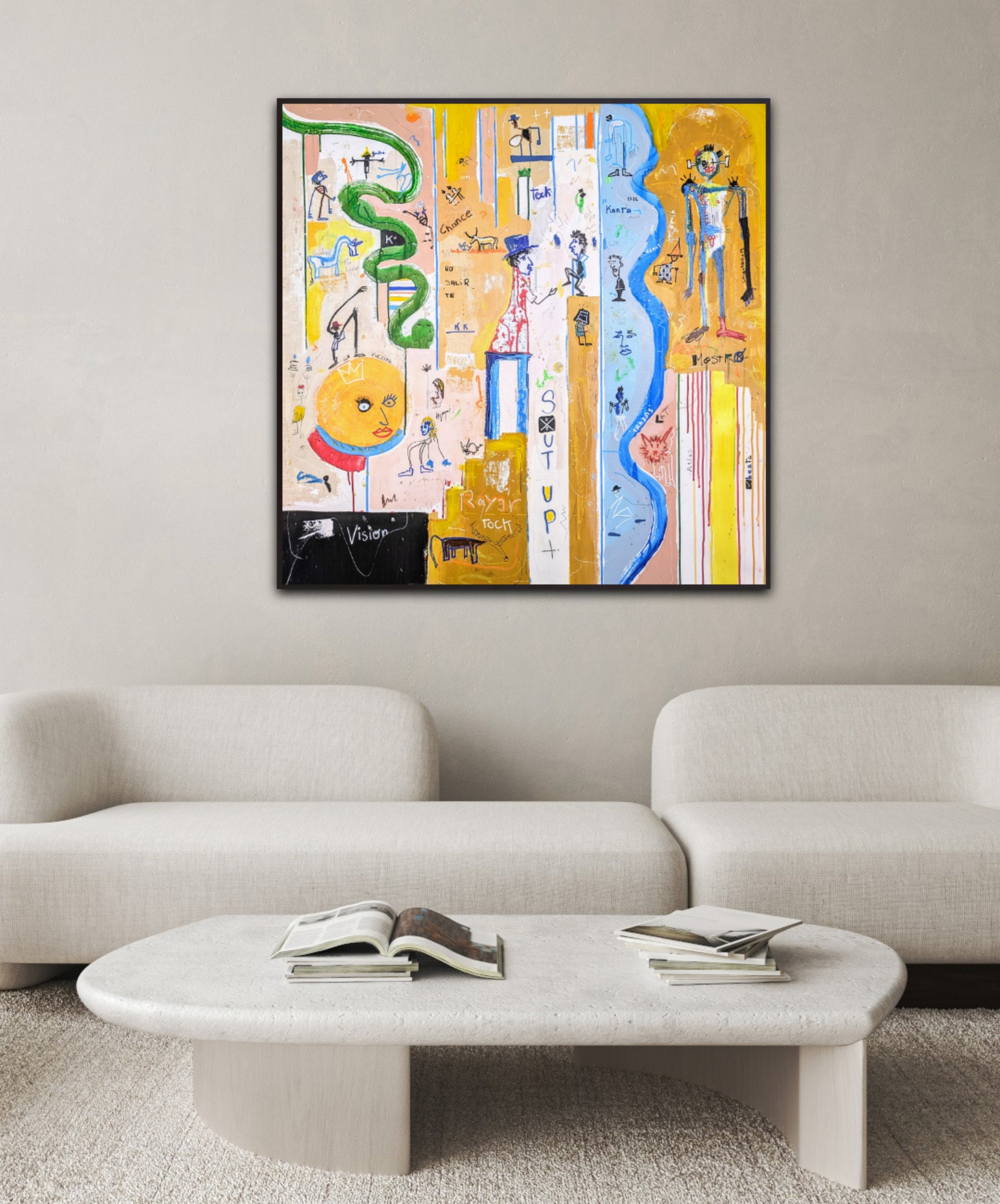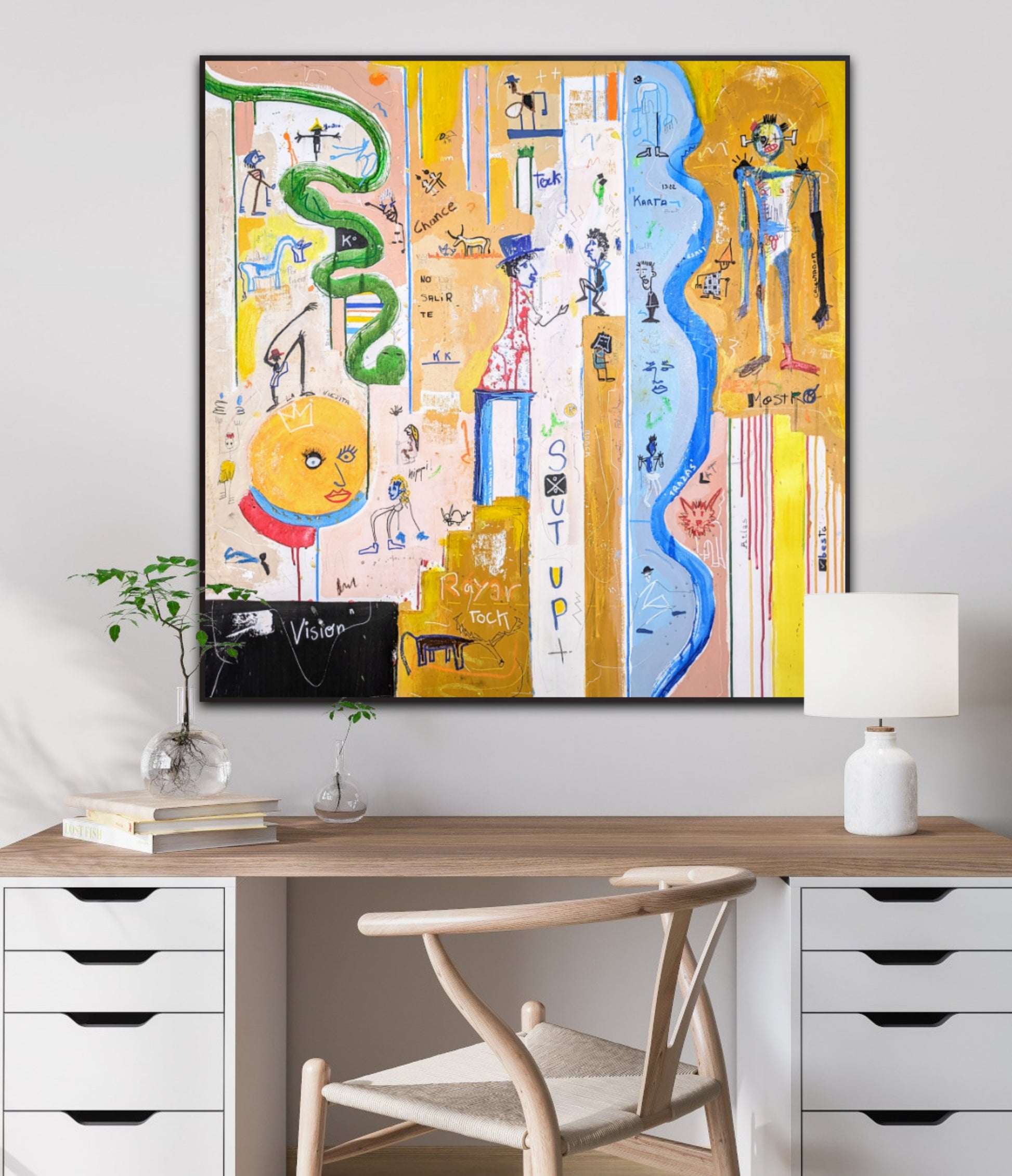 Técnica: acrílico, pigmentos, oil stick, lápiz, carboncillo y papel.