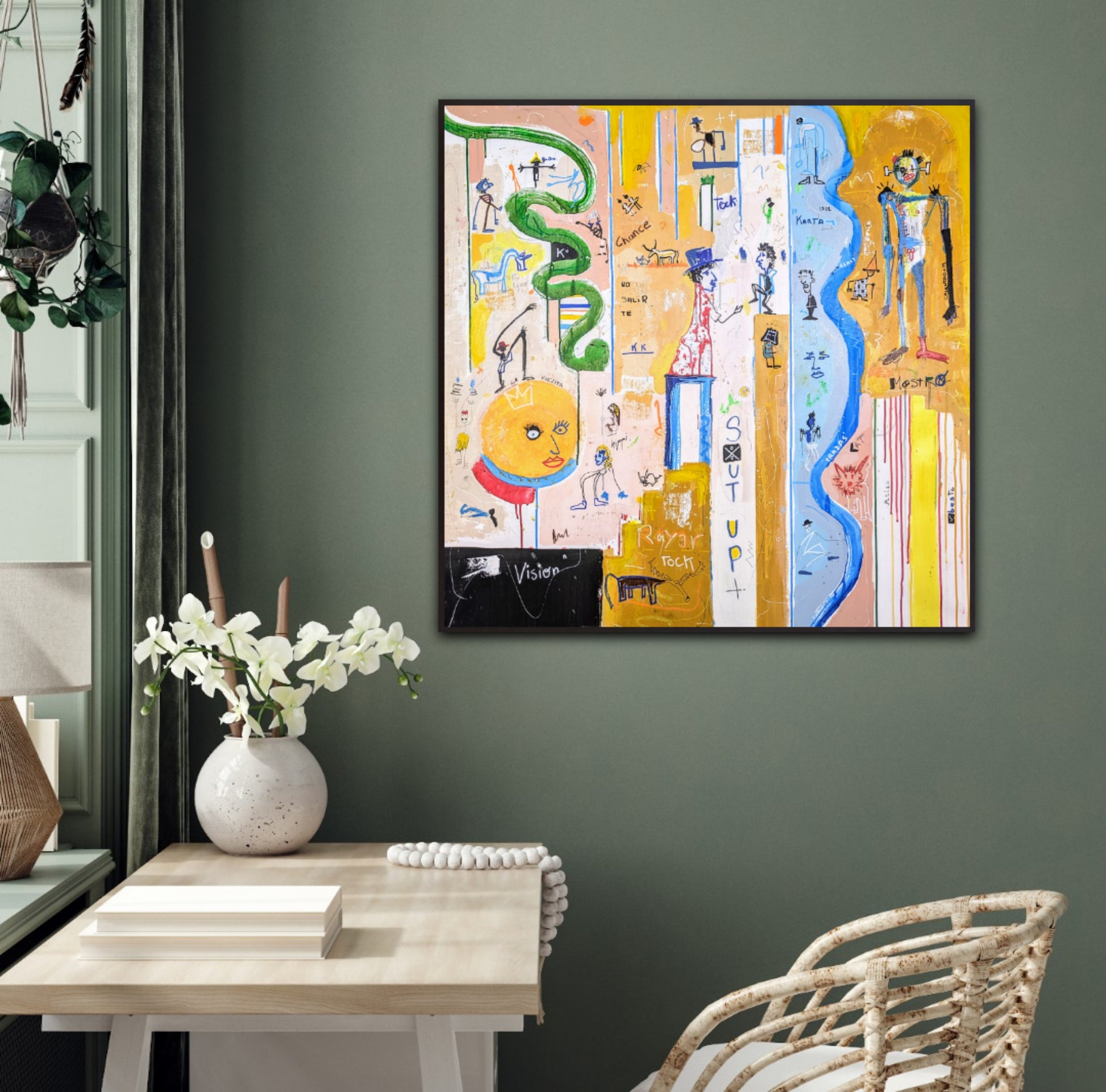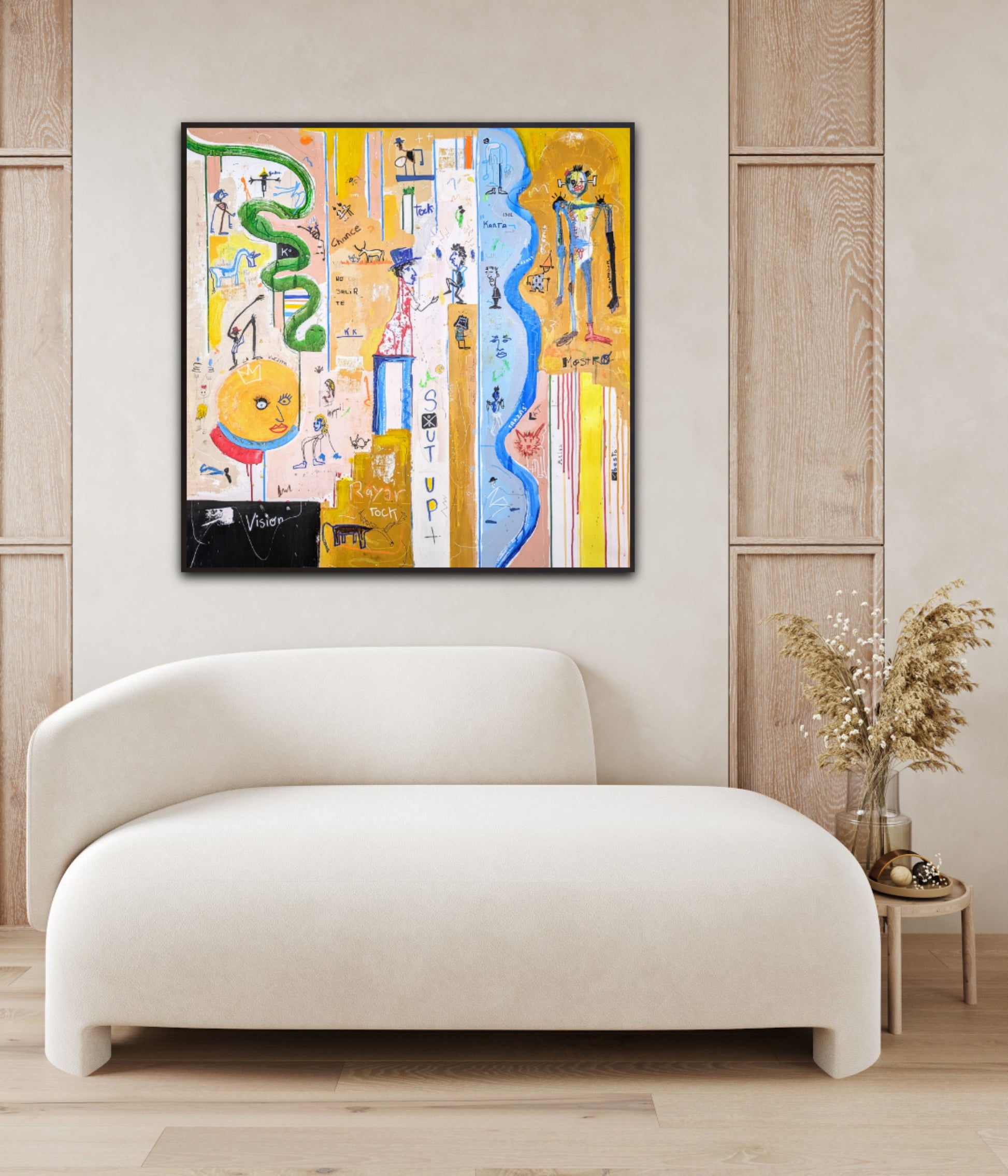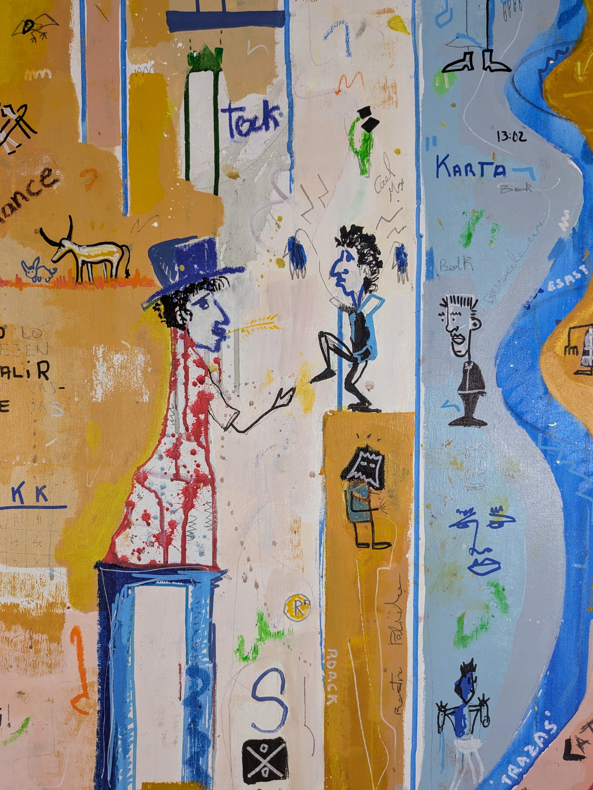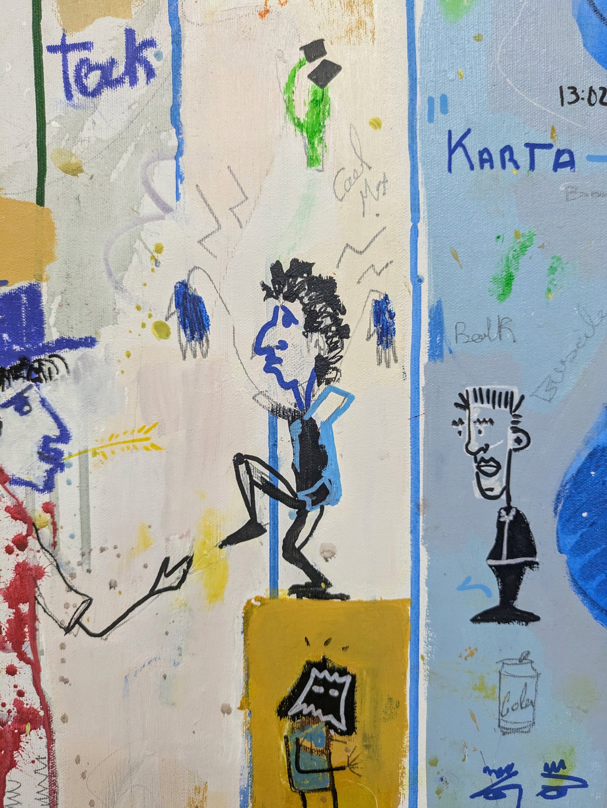 Técnica: acrílico, pigmentos, oil stick, lápiz, carboncillo y papel.